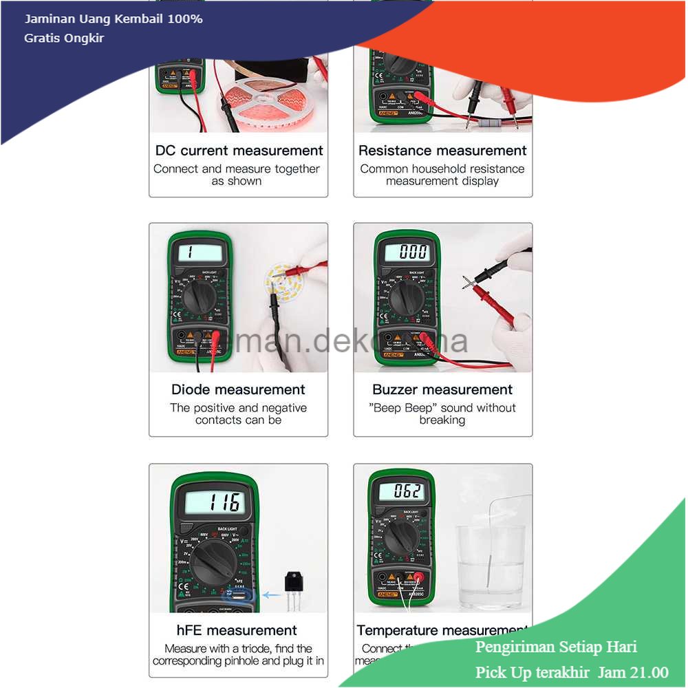 Kecil dan Mudah Dibawa Digital Multimeter dapat digunakan untuk mengukur arus listrik yang mengaliri suatu benda. Multimeter ini dilengkapi dengan LCD dan hadir dengan design yang ringan dan kecil sehingga dapat Anda bawa kemana saja. Fitur Akurat dan Detail Digital Multimeter dapat menampilkan perhitungan daya hingga 1999. Cocok Untuk Teknisi Listrik Digital Multimeter ini dapat digunakan untuk tes tegangan AC/DC voltage, current, resistance dan lainnya Hemat Baterai Digital Multimeter ini memiliki fitur energy saving, alat ini akan secara otomatis mati apabila tidak digunakan.
