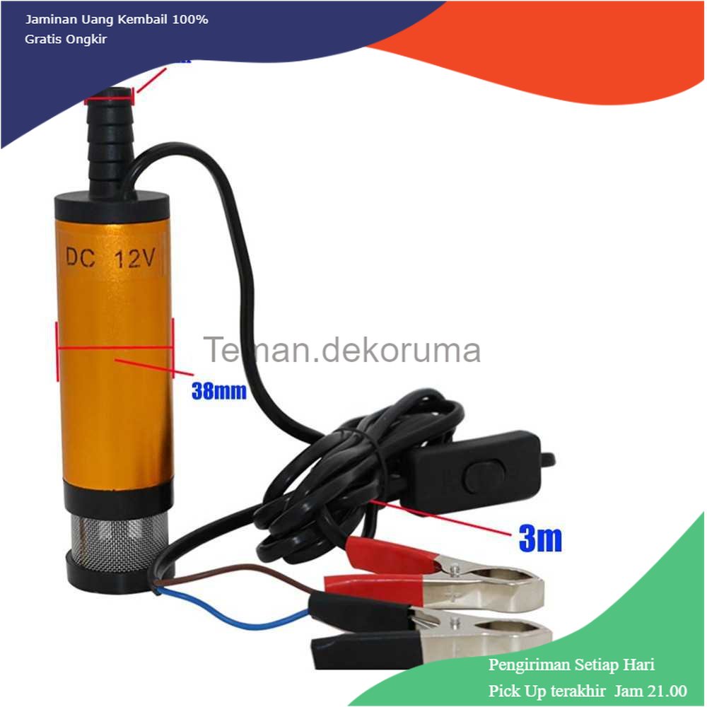 Pompa portabel yang dapat membantu Anda untuk memindahkan oli / bensin ke wadah atau tempat lain secara mudah, memerlukan tenaga listrik output sebesar 12 V yang bisa Anda pakai dengan menggunakan tenaga aki mobil. Fitur Transfer Minyak Alat ini berguna untuk memindahkan oli atau bensin dari tangkinya, tidak perlu sulit karena alat ini menggunakan tenaga listrik untuk menyedot airnya. Sedotan Kencang Rata-rata pergerakan oli 12 L/menit, self priming, RPM 8500, cocok dijadikan sebagai Submersible Pump car Anda. Mudah Digunakan Pengoperasian alat ini hanya dengan menekan tombol on off, memiliki kabel panjang kira-kira 3 meter sebagai sarana transfer oli. Cocok untuk air pump rumah, diesel atau oli.