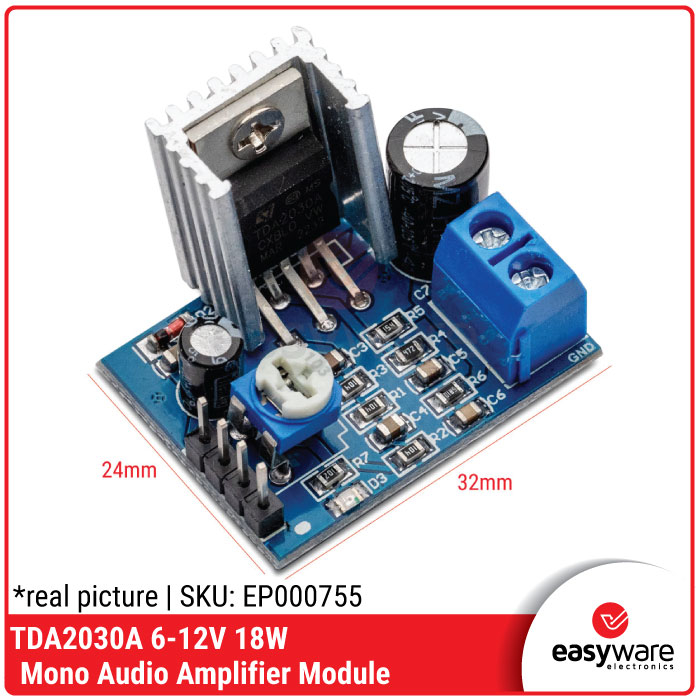 Spesifications : - Onboard TDA2030A audio power amplifier chip - Mono Single channel 18W power amplifier circuit design. - Onboard the loudspeaker wiring seat. - Onboard 10K adjustable resistor, can adjust the enlarged volume. - Onboard power indicator. - Chip main has drawn, you can directly enter the audio signal. - Working voltage: 6 ~ 12V.