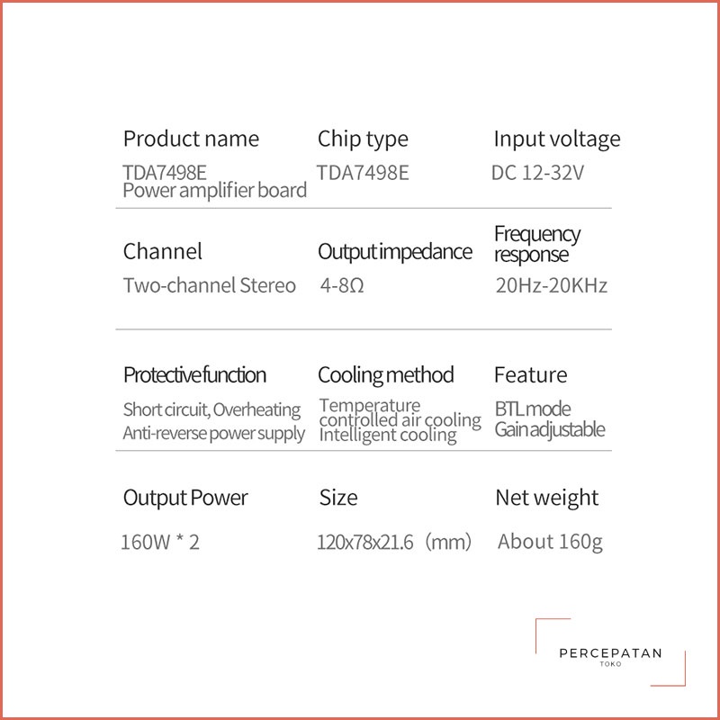 【 Specification: 】 Amplifier chip: TDA7498E Working voltage: DC 15-36V (recommended 32V, 8A, if the power is too small will appear distortion, etc.) Output power: 2 x 160W Track count: two track stereo Efficiency: 85% Applicable speaker impedance: 4/6/8 ohm (best is 8ohm) PCB size: 120mm x 78mm x 21.6mm Weight: approx. 160g