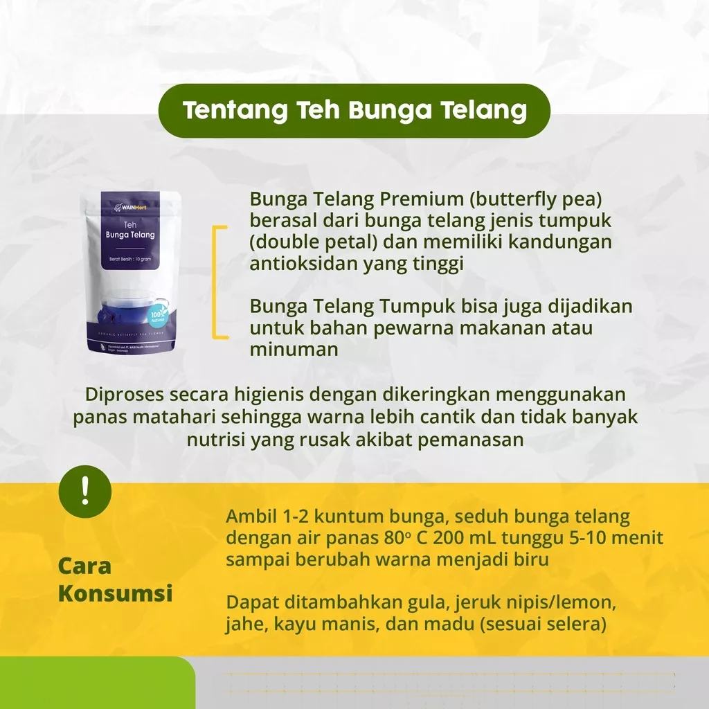 CARA KONSUMSI : ➡️ Ambil 1-2 kuntum bunga ➡️ Seduh Bunga Telang dengan air panas 200ml ➡️ Tunggu 5-10 menit sampai berubah warna menjadi biru ➡️ Dapat ditambahkan gula, jeruk nipis/lemon, jahe, kayu manis, dan madu sesuai selera.