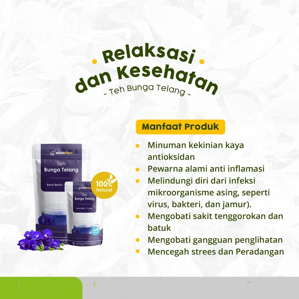 MANFAAT BUNGA TELANG : ✔ Minuman kekinian kaya antioksidan ✔ Pewarna Alami anti inflamasi ✔ Melindungi diri dari infeksi mikroorganisme asing seperti virus, bakteri dan jamur ✔ Mengobati sakit tenggorokan dan batuk ✔ Mengobati gangguan penglihatan ✔ Mencegah stress dan peradangan