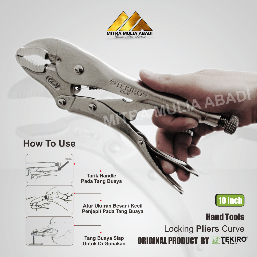 Kegunaan / Fungsi : TEKIRO Tang Buaya Bengkok 10 INCH merupakan tang jepit berbahan chrome vanadium yang didesain ergonomis yang dapat digunakan untuk mencengkram atau memegang komponen yang akan di buka dengan cara diputarkan bagiannya. Tang ini juga dapat digunakan untuk mengencangkan atau melonggarkan mur dan baut. Bentuk tang ini menyerupai bentuk buaya dengan moncong yang ebsar, lebar dan bergerigi, sehingga sring dikenal dengan sebutan tang buaya.