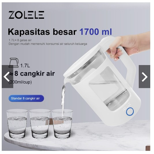 Deskripsi Produk: 1.Kapasitas yang besar hingga 1.7 liter untuk penyajian 8 gelas atau setara dengan 200ml,cocok untuk 3-5 orang. 2.Kettle ini terbuat dari material bodi kaca borosilicate berkualitas tinggi jadi mampu menahan perubahan temperatur dari dingin ke panas ataupun sebaliknya. 3.Pelestarian panas lapisan ganda dan anti panas, insulasi panas, aman untuk tangan,Daya tinggi 1355W, perebusan efisien tanpa menunggu. 4.Filter baja tahan karat, aman dan sehat,Mulut lebar, mudah dibersihkan,Basis kumparan berliku dari jenis penyimpanan, tidak menempati ruang. 5.Mendidihkan air,pelestarian panas 24 jam fungsi sepanjang hari. 6.Kettle for all ages! Dapat digunakan untuk semua umur dari bayi hingga orang tua. 7.Air hangat (45 C), air panas (55 C), susu formula (70 C), kopi (85 C), teh (90 C), air mendidih (100 C). 8.Teko listrik ini dapat digunakan untuk berbagai kebutuhan seperti menghangatkan kopi, susu, teh dll. 9.Lampu pemanas visual, mati otomatis saat mendidih,Satu sakelar kunci, sederhana dan nyaman,Pegangan yang nyaman, pembuangan yang nyaman, dan penghematan tenaga kerja.