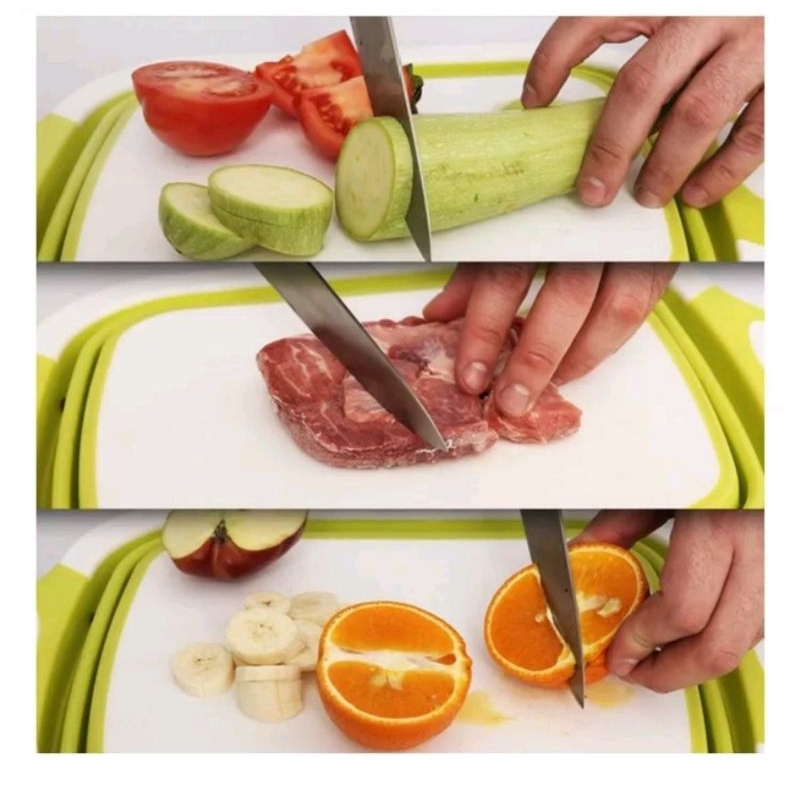 Telenan Multifungsi dibuat dengan permukaan yang kasar sehingga mempermudah anda dalam memotong bahan-bahan dapur supaya tidak mudah tergelincir Didesain Fleksibel agar dapat dilipat Fungsi 3 in 1: Memotong, Mencuci & Meniriskan, Dijadikan Wadah