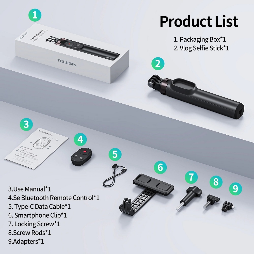 Kelengkapan Produk 1 x Telesin Mini Tripod Tongsis Selfie Stick Smartphone and Action Cam with Remote Control - TE-RCSS-001 1 x Remote Control 1 x Kabel USB Type-C 1 x Phone Clip 1 x Screw for Phone Clip 1 x Locking Screw 1 x Adaptor 1 x Panduan Penggunaan