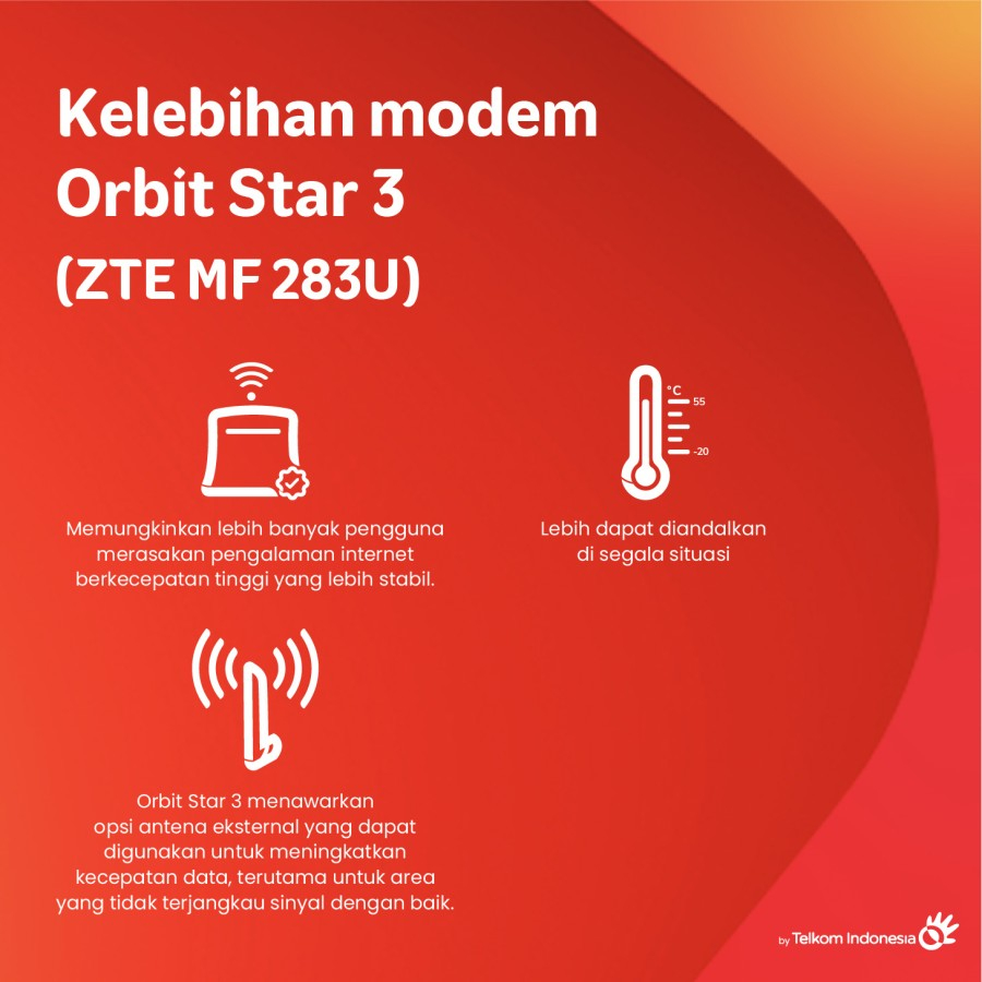 Keunggulan Telkomsel Orbit: - Jangkauan luas dengan sinyal 4G LTE Telkomsel - Bisa beli kuota sesuai kebutuhan tanpa harus terikat biaya bulanan - Aktivasi mandiri dengan mudah & cepat hanya melalui 1 aplikasi MyOrbit - Bisa digunakan di rumah ataupun di mana saja yang terjangkau jaringan Orbit tanpa perlu instalasi ulang