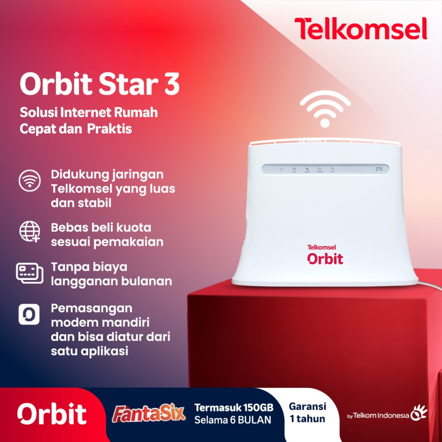Beli modem Orbit Star 3 sudah sekaligus dapat bonus paket data FantaSix 150 GB untuk 6 bulan, loh! Promo FantaSix: Free Bonus Kuota 150GB selama 6 bulan pertama (25GB/30 hari untuk 6 bulan pertama). Paket data 25GB dari Promo FantaSix akan menjadi prioritas utama untuk dikonsumsi, baru kemudian paket data lainnya yang Anda beli. Untuk info lebih lengkap.