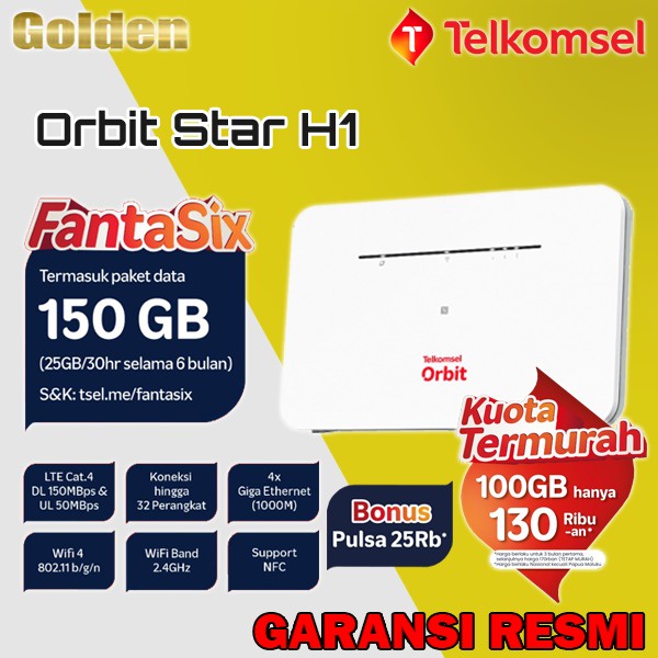 Spesifikasi Modem Orbit Star H1: - Huawei B311 - Ukuran modem 198 x 125 x 25 (mm) - DL / UL Cat 4 - 2x2 MIMO LTE - 2.4 GHz - 32 Pengguna - Up to 32 Mbps - 4 Port LAN - Garansi 12 Bulan