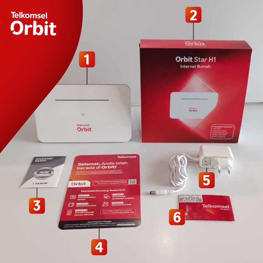 Termasuk dalam kemasan pembelian: - Modem Orbit Star H1 - Kartu SIM Orbit Telkomsel - Kartu panduan - Charger - Kartu garansi modem