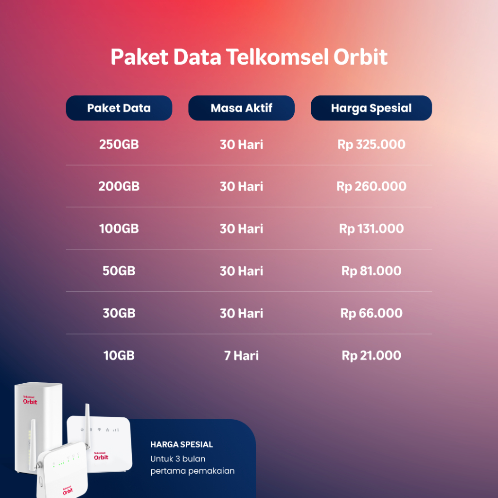 Keunggulan Telkomsel Orbit: - Jangkauan luas dengan sinyal 4G LTE Telkomsel - Bisa beli kuota sesuai kebutuhan tanpa harus terikat biaya bulanan - Aktivasi mandiri dengan mudah & cepat hanya melalui 1 aplikasi MyOrbit - Bisa digunakan di rumah ataupun di mana saja yang terjangkau jaringan Orbit tanpa perlu instalasi ulang