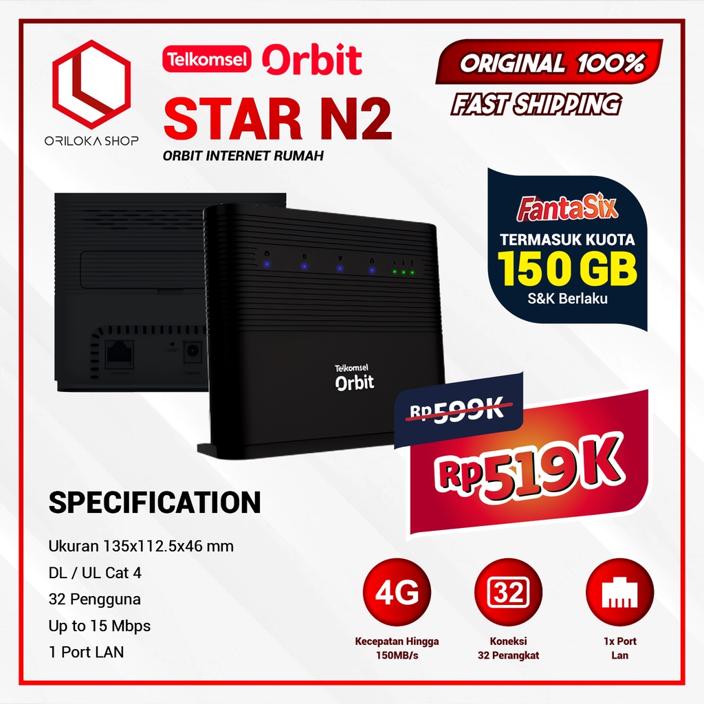 Beli modem Telkomsel Orbit Star N2 sudah termasuk bonus paket data FantaSix 150 GB untuk 6 bulan, loh! Promo FantaSix: Free Bonus Kuota 150GB selama 6 bulan pertama (25GB/30 hari untuk 6 bulan pertama). Paket data 25GB dari Promo FantaSix akan menjadi prioritas utama untuk dikonsumsi, baru kemudian paket data lainnya yang Anda beli. Untuk info lebih lengkap, kunjungi https://www.myorbit.id/id/Promo-Fantasix