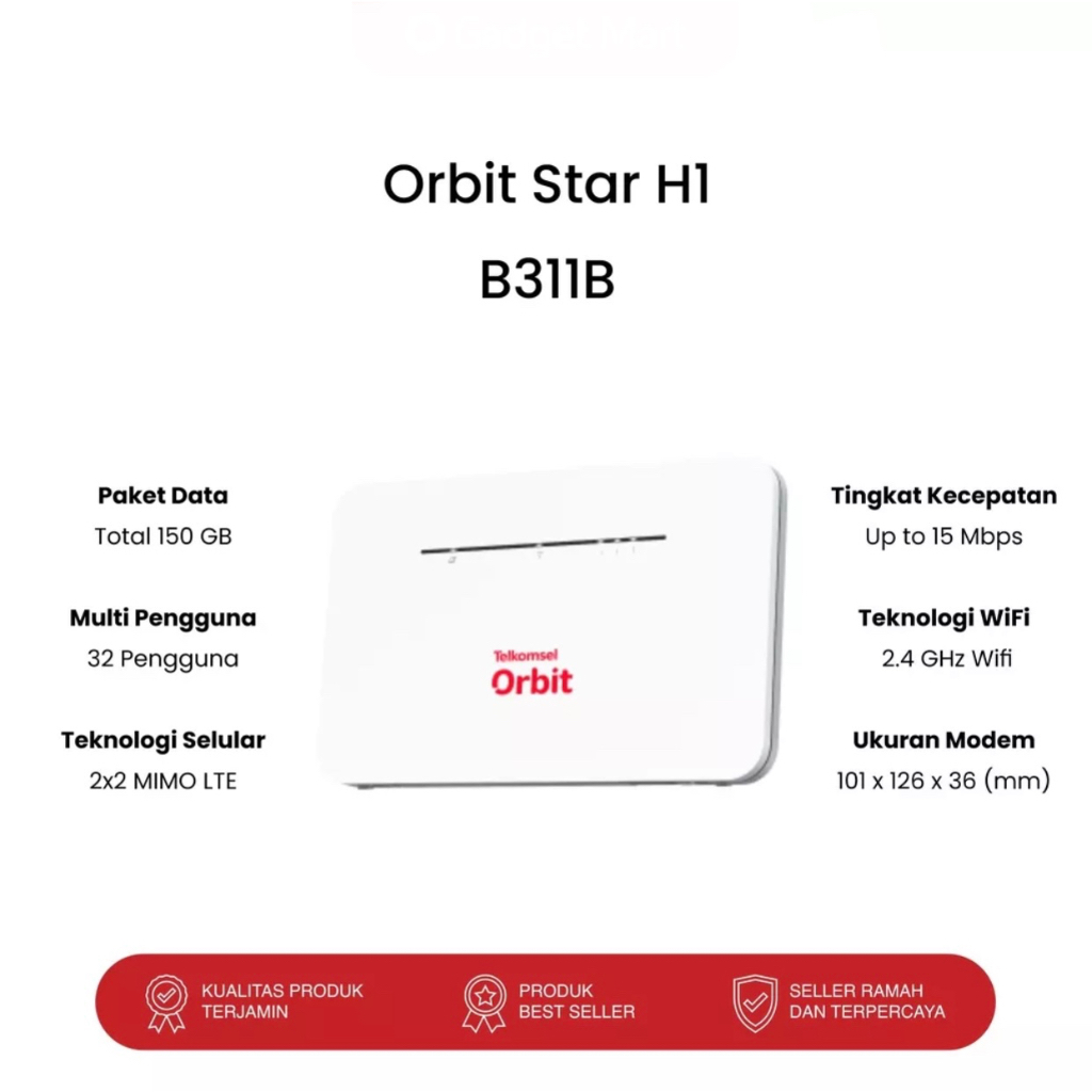 Yang Di Dapatkan Dalam Paket Pembelian : - Modem Orbit Star Z1 (ZTE) / N1 (HKM) / N2 (HKM) - Adaptor Charger ( Input = 100-240V - 50/60Hz = 0.5A, Output = 12V =1A ( 12W ), Panjang kabel = 160cm ) - Sim Card Telkomsel ( Bonus kuota 150GB = 25GB/30 hari berlaku selama 6 Bulan ) - Kabel LAN 1 meter - Kartu Garansi - Orbit Information