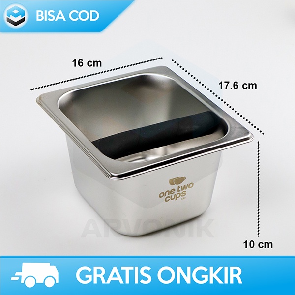 1 x One Two Cups Wadah Kopi Espresso Knock Box Waste Container 17cm - KB3 Spesifikasi Dimension 16 x 17.6 x 10 cm Material Stainless Steel