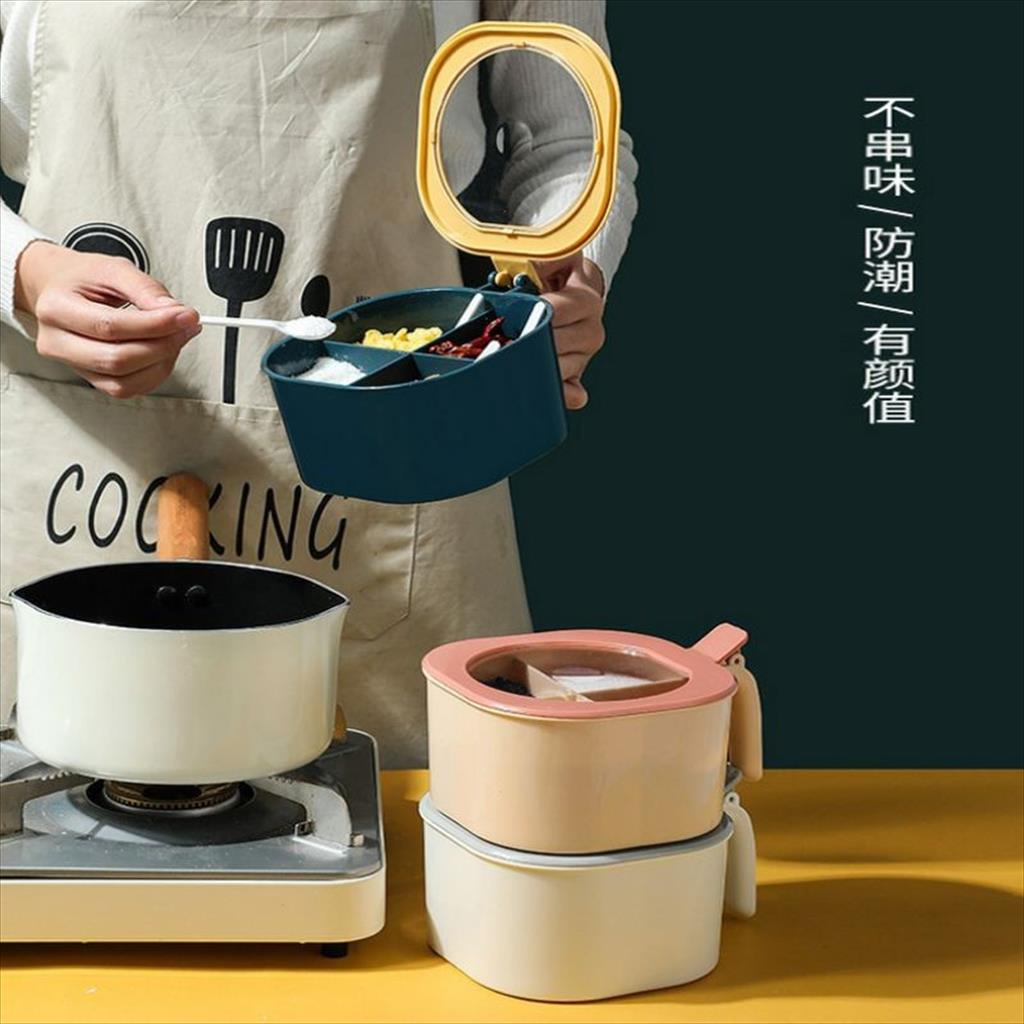 Tempat bumbu praktis dengan design bentuk SQUARE, dalamnya terdapat 4 sekat, Ada tutupnya, dilengkapi sendok bumbu dan tangkai pegangan.