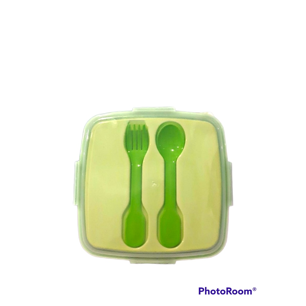 Dilengkapi Double cap Tutup tempat sendok garpu dan tutup bagian atas transparan dengan empat pengait/kuncian yang mudah dibuka tutup dengan rapat tidak mudah tumpah,mudah dibersihkan serta praktis mudah dibawa kemana - mana seperti : saat bekerja,sekolat,toure,piknik,berkemah,dll