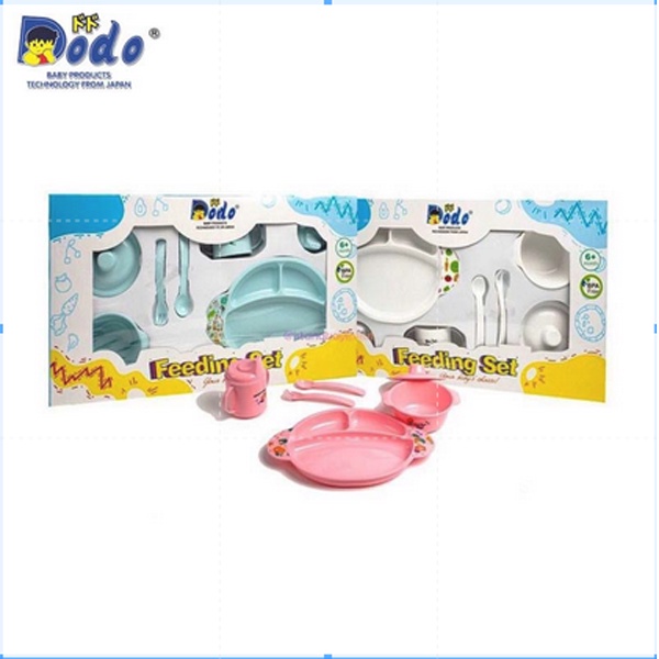 Dodo feeding set adalah alat perlengkapan makan bayi yang di desain dengan unik, lucu, dan aman untuk Bayi Terdiri dari Piring, Garpu, sendok dan cangkir minum untuk bayi Dodo Feeding Set sudah BPA free bebas dari zat - zat berbahaya dan sangat aman untuk bayi.