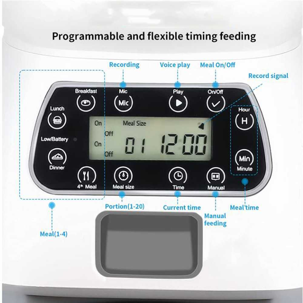 Fitur Pengaturan Waktu Makan Karena dispenser makanan ini otomatis, maka Anda dapat mengatur kapan waktu makan hewan Anda dengan sangat mudah. Anda dapat mengatur makanan hewan Anda berdasarkan makan pagi, makan siang, makan malam, dan juga makan tambahan. Anda pun dapat mengatur porsi makanan yang akan keluar di sistem pengaturan, ada 20 pengaturan porsi makan di mana setiap porsinya memiliki berat sekitar 5 gram.