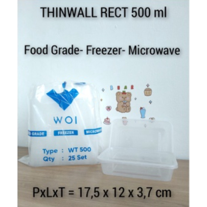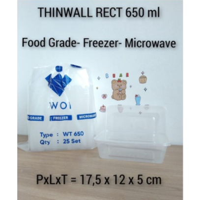 Spesifikasi Ukuran Thinwall : * 500Ml = 17,5 x 12 x 3,7 cm * 650Ml = 17,5 x 12 x 5 cm * 750Ml = 17,5 x 12 x 5,5 cm * 1000Ml = 17,5 x 12 x 7,5 cm Bahan Thinwall : Plastik Food Grade
