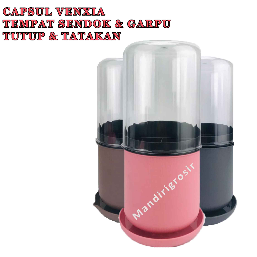 Tempat sendok CAPSUL VENXIA terbuat dari pelastik yang mudah di gunakan, terdapat saringan di bagian bawah yang berguna untuk meniriskan air agar tidak mengenandap, Terdapat sekat pemisah yang memudahkan untuk membedakan garpu dan sendok atau yang lainya.
