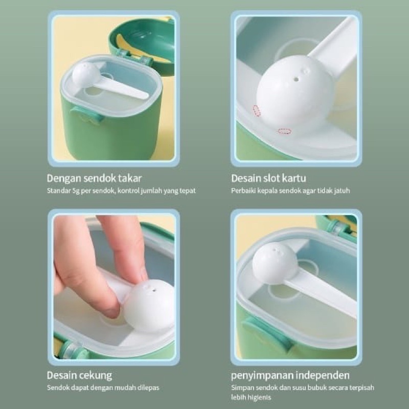 Fitur produk : • Terdapat sendok jadi tidak repot lagi bawa sendok susu • Double lid (ANTI TUMPAH) meski dibolak balik sekalipun • High quality plastik (BPA FREE) yang aman untuk bayi dan anak • Terdapat tempat khusus sendok jadi sendok tidak tercampur aduk dengan susu