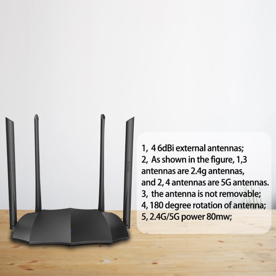 Standar & Protokol IEEE802.3,IEEE802.3u,IEEE802.3ab Antarmuka 1*10/100/1000Mbps WAN port 3*10/100/1000Mbps LAN ports Antena 4*6dBi external dual band antennas Tombol 1*WPS/Reset button Daya Listrik Input:AC 100-240V—50/60Hz Output:DC 9V 1A LED 1*LED Ukuran 200x127x33.6mm(L*W*H) Standar Nirkabel IEEE 802.11ac/a/n @5GHz IEEE 802.11b/g/n @2.4GHz Laju 2.4GHz: 300Mbps 5GHz: 867Mbps Frekuensi 2.4GHz & 5GHz Keamanan Nirkabel WPA-PSK/WPA2-PSK, WPA/WPA2 Wireless Security : Enable /Disable Jenis Koneksi Internet PPPoE, Dynamic IP, Static IP Support automatic access detection Supports broadband account automatic transfer Mode Operasi Wireless Router Mode AP Mode Universal Repeater mode WISP Mode DHCP DHCP Server DHCP Client List DHCP Reservation Server Virtual Port Forwaring DMZ Host UPnP Keamanan Client Filter(supports black list and white list) Parental Control(supports black list and white list) Remote Web Management Firewall Forbid WAN PING from internet DDNS Support DynDNS, 88ip Fungsi Lain Broadband management MAC address clone System Log Backup & Restore configurations Firmware upgrade from local Suhu Operating Temperature: 0℃ ~ 40℃ Storage Temperature: -40℃ ~ 70℃. Kelembapan Operating Humidity:10% ~ 90% RH non-condensing Storage Humidity: 5% ~ 90%RH non-condensing. Pengaturan Default Default Access: tendawifi.com or http://192.168.0.1 Sertifikasi CE,FCC,CCC,SRRC Isi Paket Wireless Router*1 Gigabit Ethernet Cable*1 Power Adapter*1 Installation Guide*1