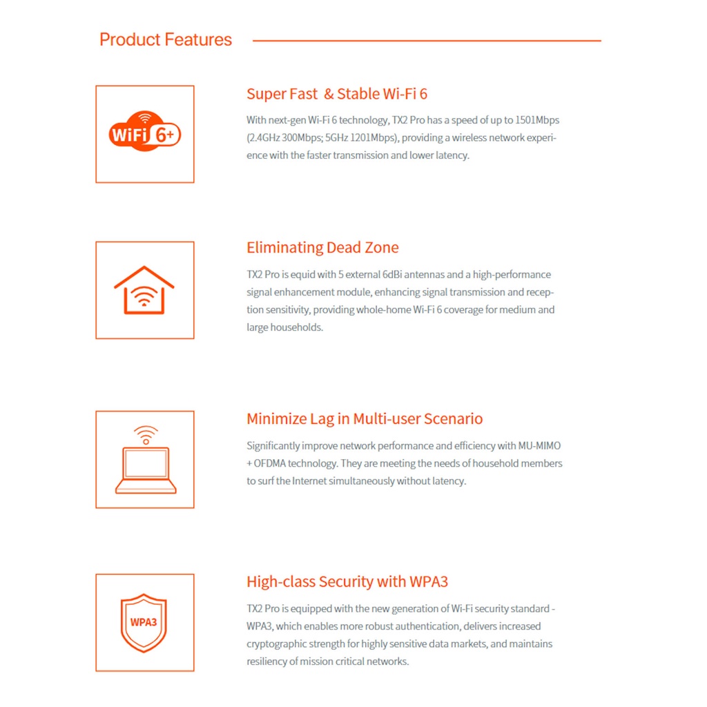 TX2 Pro adalah router gigabit Wi-Fi 6 dengan kecepatan hingga 1501 Mbps (2.4GHz: 300Mbps, 5GHz: 1201 Mbps) , dilengkapi dengan 4 antena eksternal dengan gain tinggi 6dBi yang memungkinkan lebih banyak perangkat terhubung ke internet secara bersamaan dengan latensi lebih rendah. Efisiensi transmisi TX2 ditingkatkan secara signifikan dengan teknologi OFDMA+MU-MIMO. Menghubungkan lebih banyak perangkat berkabel untuk kecepatan transfer lebih cepat dengan port gigabit ethernet memastikan semua jenis perangkat berkabel bekerja dengan lancar dan menikmati jaringan berkecepatan ultra.