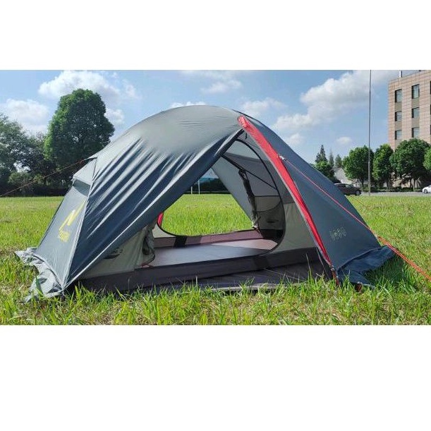 Tenda camping kapasitas 2 orang - two entrance - fly size ( 70+160+70)x230x125Cm - inner size 150wx220Lx120h Cm - pabrik 100% polyester - pole D7. 9mmx2pcs alumunium 7001 T6 - waterproof 4000nm - peg D6mmx17.5cmx11pcs alumunium Repair kits