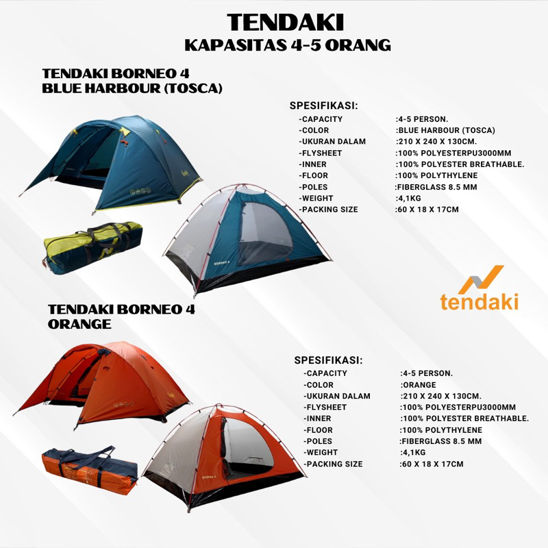 Detail TENDAKI •Tenda Dome Termurah •Moluccas 4 pro •Java 4 •BORNEO 4 •Java 4 Light •Arundaya 4 • Double Layer Your browser does not support the video tag. Video perkenalan produk TENDAKI •Grosir Tenda Dome Termurah •Tendaki •Java 4 Pro •BORNEO 4 •Java 4 Light •Arundaya 4+ Air •NSM 4 •Moluccas 4 pro •Kapasitas 4 Orang •T210 Ripstop 3000mm Double Layer. Sumber: Shopee.