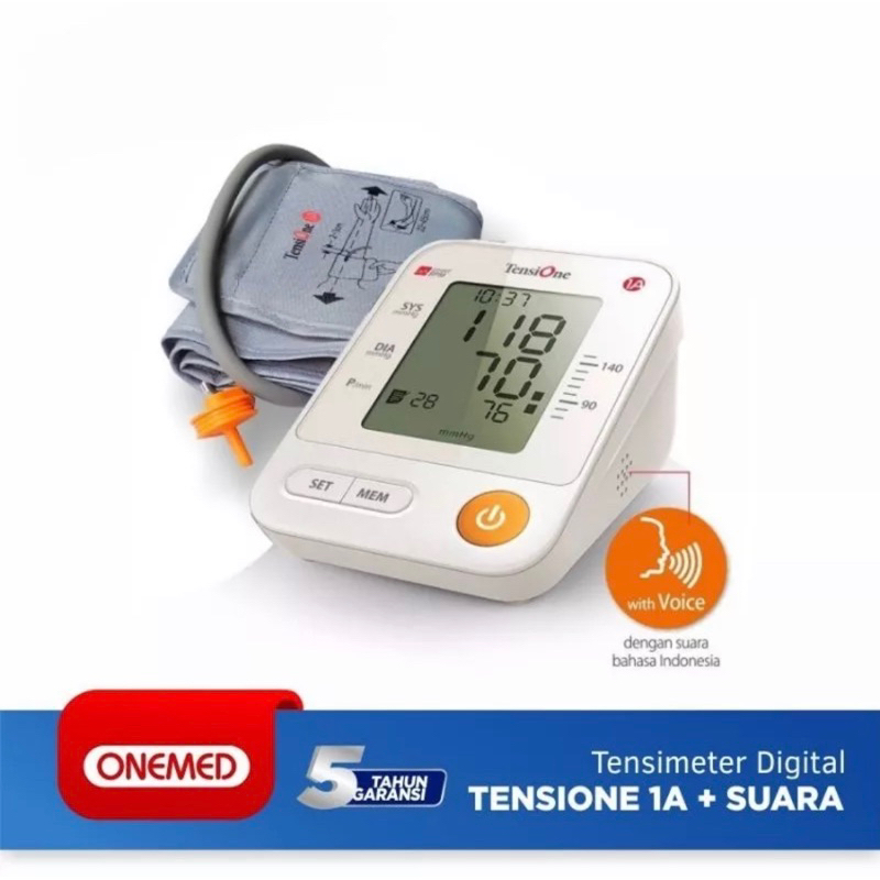 Tensi One 1A+ suara, alat pengukur tekanan darah digital otomatis bersuara bahasa Indonesia, dipakai di lengan atas, fungsi akurat, mudah dan cepat dibandingkan dengan tensimeter HG hasilnya tidak ada perbedaan yang significant (3 mmg HG) ini dibuktikan dengan pengukuran dokter memakai tensi Hg riester dan alat kalibrasi Fluke