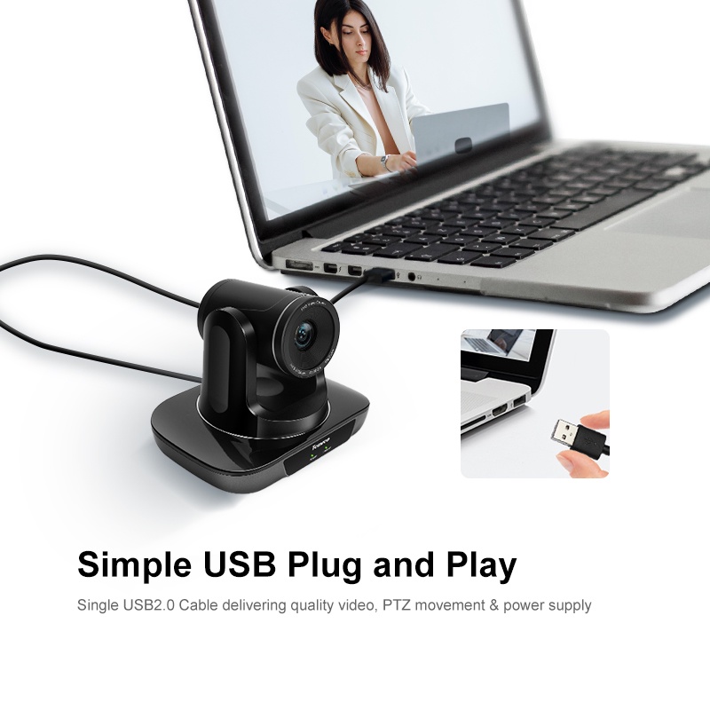 UVC1.1 dapat menggunakan perangkat lunak untuk mengontrol kamera secara langsung Automatic camera control 1/2.8″SONY CMOS 5K(3840X2160 )Ultra HD video resolution Fixed Focus : f= 2.2 mm 5X digital zoom with accurate, smooth, and silent PTZ movement Preset: 10 via IR remote setting (255 via RS232) Equipped with IR remote control, easy to operate High precise motor positioning (Pan:100°,Tilt: 80°) UVC/plug-and-play at MJPEG via USB, 4K@30FPS Support ceiling mount, wall mount and tripod mount 124 degrees Wide field of view with no video distortion Quiet & smooth mechanism movement, accurate & fast focus Support Visca, Pelco-P&Pelco-D protocol, RS232/RS485 Camera Control Compatible with most leading video conferencing software and platform