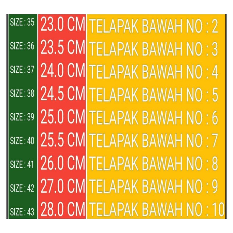 ✅ nomor telapak bawah ✅ Size label ✅ Ukuran ( cm ) √ no 2 size 35 : 23.0 cm √ no 3 size 36 : 23.5 cm √ no 4 size 37 : 24.0 cm √ no 5 size 38 : 24.5 cm √ no 6 size 39 : 25.0 cm √ no 7 size 40 : 25.5 cm √ no 8 size 41 : 26.0 cm √ no 9 size 42 : 27.0 cm √ no 10 size 43 : 28.0 cm