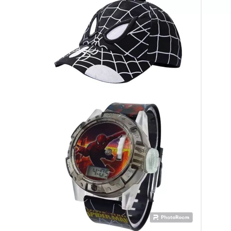 (Terima Cod)Jam Tangan Anak-Anak Led Karakter Musik Lampu+Topi Spiderman Strap rubber Ud 1 Set 4/9 Tahun