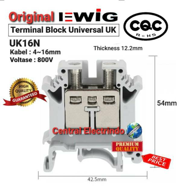 Merk EWIG. Terminal Block Universal Din Rail. Type : UK16N. Wire flexibel lead : 4~16mm. Voltage : AC 800V Rigidity lead : 2.5~25mm. Current : 101A. Colour : Grey. Electrical Mounting : Screw Terminal.