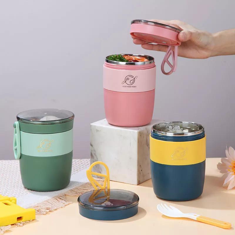 Fitur: 1. Tetap hangat dan dingin, dapat diisi dengan air agar tetap hangat.Menjaga kehangatan sampai 6 jam 2. Tertutup dan anti bocor, 3 Cocok untuk membuat susu, membuat kopi, minum, sup bergizi, dll. 4. Pengait dan pegangan, mudah dibawa 5. Sudah di lengkapi sendok garpu