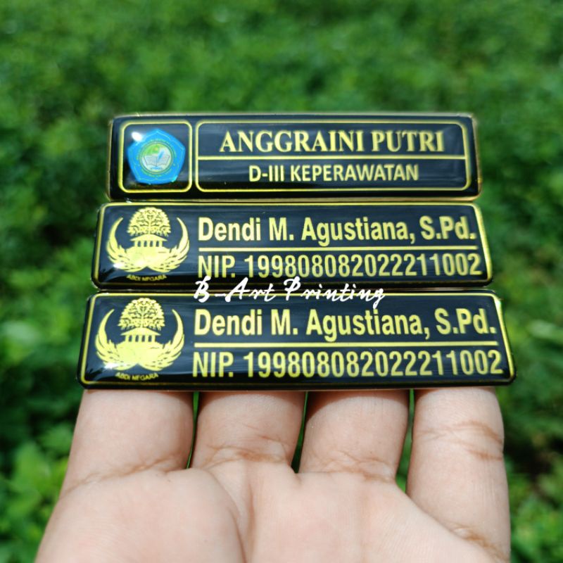 Name tag resin peniti/magnet Dimensi ( bisa order ukuran custom ): P: 8 cm L: 2 cm - tebal plat : 0.5 mm (lebih tebal). - peniti : besi uk. 3.8 cm ( ukuran besar). - magnet : besi bertuliskan caution magnet. Uk. 4,8 cm (ukuran besar). - menggunakan resin berkualitas sebening kaca dan mengkilap . - menggunakan mesin printer dan tinta original untuk hasil cetak warna yg tajam dan tahan lama. - nametag di bungkus dengan plastik wrap per pcs untuk jaminan terjaga nya kualitas produk selama proses pengiriman.