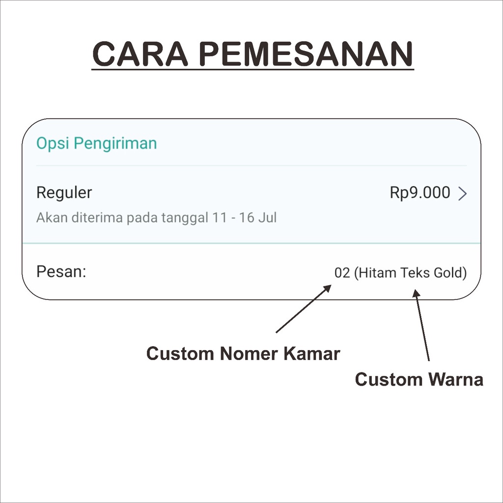 Cara pemesanan : Cantumkan Nomer kamar dicatatan, Contoh : 02 (Hitam Teks Gold), 03 (Putih Teks Hitam)