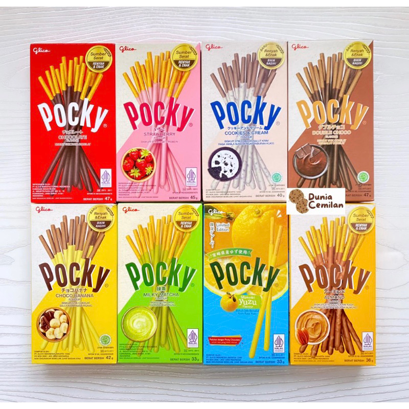 Pocky adalah stik biskuit renyah berbalut coklat berbagai rasa. Cocok sebagai cemilan saat santai Anda bersama keluarga. Rasa : 1. Coklat 47gram 2. Strawberry 45gram 3. Milky Matcha 33gram 4. Double Choco 47gram 5. Choco Banana 42gram 6. Cookies n Cream 40gram 7. Yuzu 33gram 8. Almond 36gram