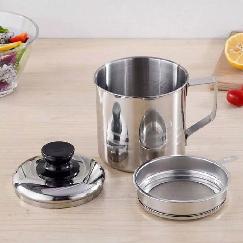 Detail TERMURAH! Wadah Penyaring Minyak Sisa Oil , Pot Stainless Steel , gelas penyaring serbaguna, gelas penyaring kinyam 1,3L