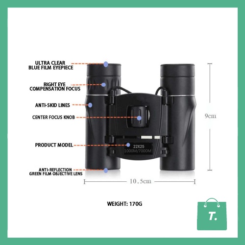 Spesifikasi Teropong Binocular Outdoor Magnification 22x25 Long Range - PMT Optical Zoom Product magnification: 22x Objective lens diameter: 25mm Eyepiece Aperture: 15mm Field of view: 5.8 Degree Vision: 1000/7000 meters Dimensi 9 x 10.5 x 4cm Lain-lain Objective coating: FMC multi-layer green film Eyepiece coating: ultra-clear green film Prism type: BAK4 Focusing method: central focus + right eye Exit pupil distance: 11mm Is it waterproof: life waterproof