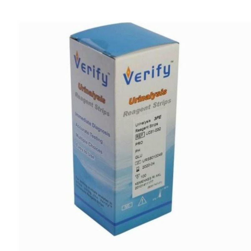 Verify 3p Reagen strip untuk analysis urine 3 parameter. Strip urine 3 parameter ini merupakan alat diagnosa standar yang umum digunakan Lab rumah sakit maupun klinik kesehatan. Hasil pemeriksaan disajikan secara semi kuantitatif. Dengan melihat perubahan warna yang di bandingkan dengan standar mencocokkan tabel warna pada botolnya