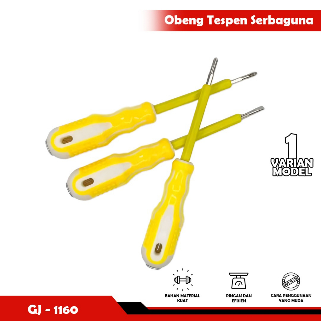 Obeng GJ1189 : - Obeng Test Pen - Didesain ergonomis - Hadir dengan 2 mata obeng yang dapat dibolak balik - Gagang terbuat dari plastik - Mata obeng tidak mudah berkarat - Memiliki ukuran besar - Panjang : 18,5 cm