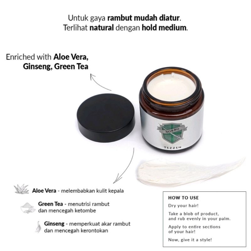 Spesifikasi Tezzen Zorro Hold : 3/5 Shine : 1/5 Scent : Swift Oud Wood Weight : 3.5 Oz / 100 gr