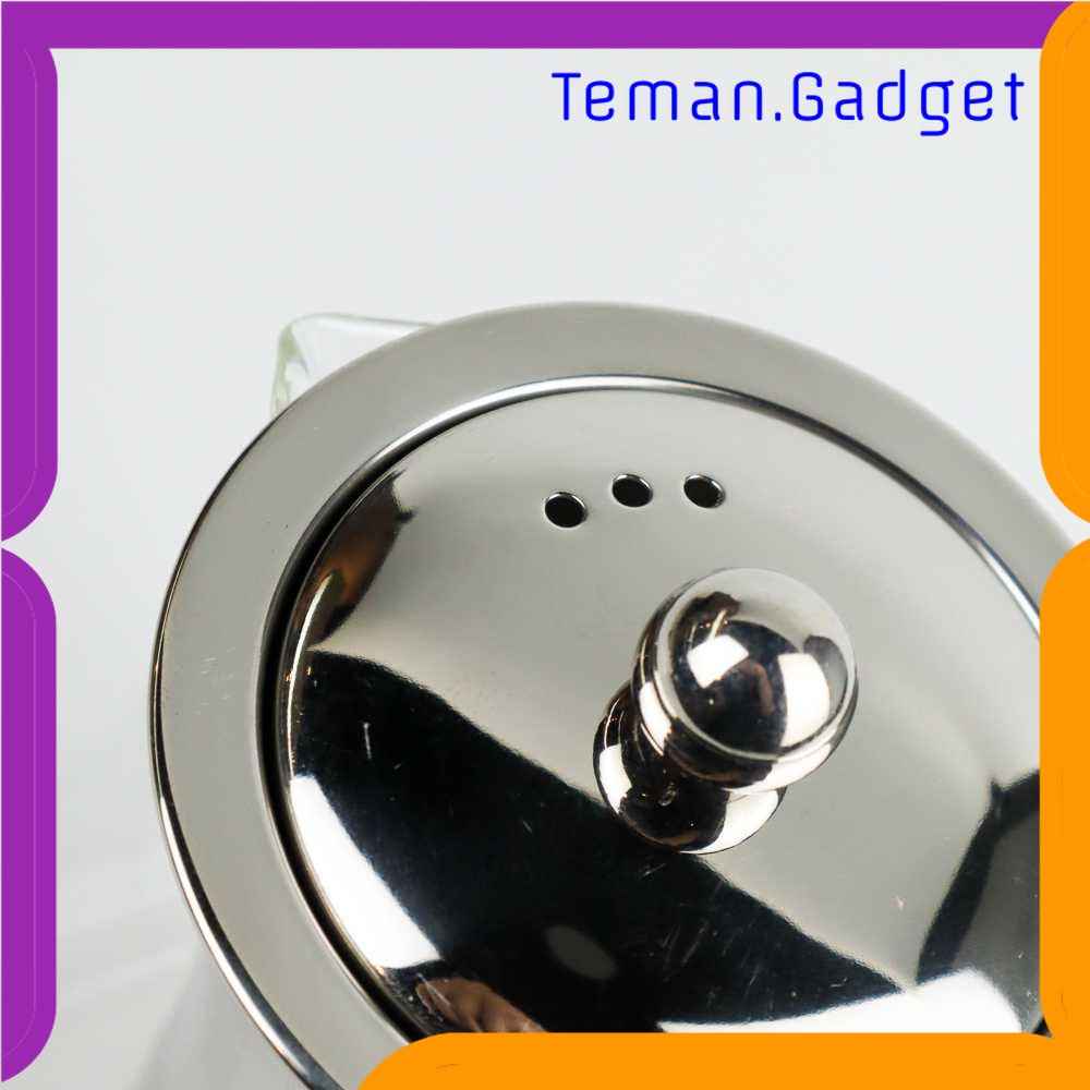 Material Kaca Borosilikat dan Stainless Steel Dimensi 450 ml: 10 x 10 x 9.7 cm 750 ml: 12 x 12 x 13.5 cm 950 ml: 12 x 12 x 14.5 cm 1300 ml: 14 x 14 x 16.5 cm Tebal Kaca: 2 mm