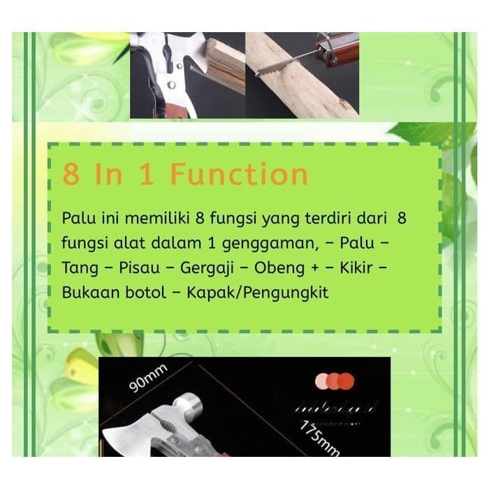 Multifunction Tools Hadir dengan berbagai macam peralatan yang sangat praktis untuk digunakan seperti Kapak, Palu, Tang, Pisau, Gergaji mini, Obeng, Pembuka botol, dll.
