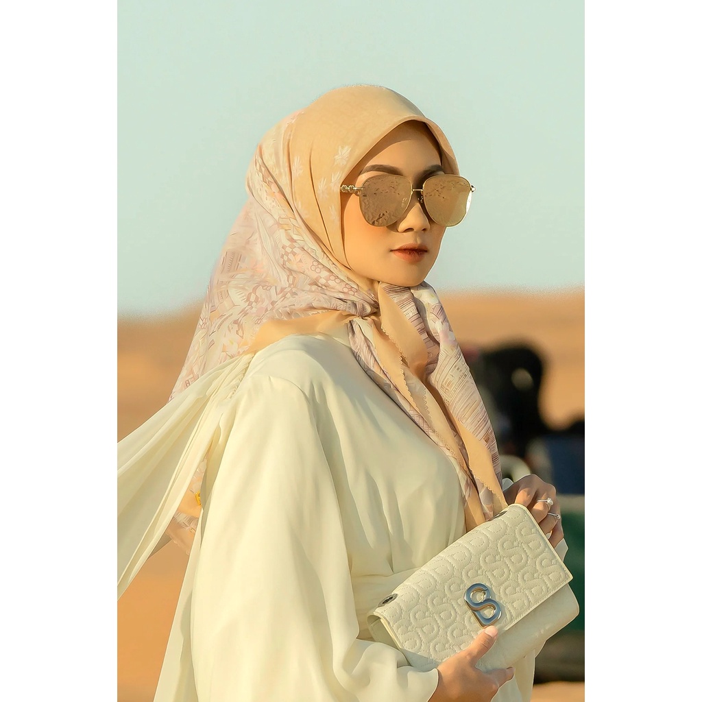 Voile Square Measurement : 110 x 110 cm Material: Tru Voile Laser-cut hem details Gold charm Completely opaque Not slippery and easy to style