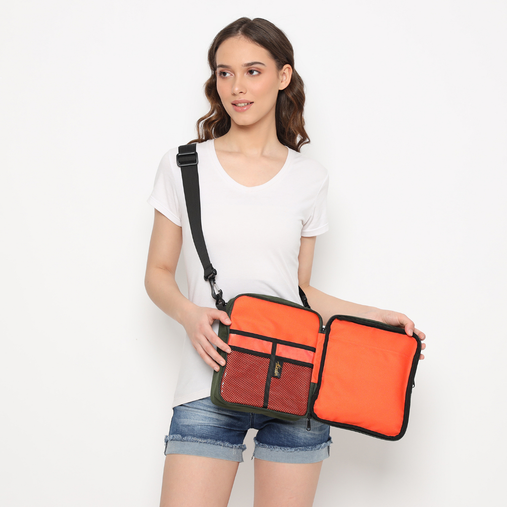 Sling bag CUBE Series dibuat dengan bahan utama kain PU coated water repellent. Lapisan dalam sling bag ini menggunakan bahan kain polyester berwarna orange yang biasanya digunakan untuk bahan utama (bagian luar) tas pada umumnya, sehingga sling bag Cube series ini semakin tebal dan kokoh. Sling bag ini di buat untuk menunjang keseharianmu membawa barang-barang yang wajib selalu dibawa. Sling bag Cube mempunyai banyak 2 ruang utama dan 6 slot didalamnya, sehingga barang- barang seperti buku tulis, ipad, dompet, handphone, charger, powerbank, card, dll dapat tertata dengan baik. Plastic Hardware dan zipper menggunakan merk YKK yang merupakan merk terpercaya di seluruh dunia untuk produk tsb.
