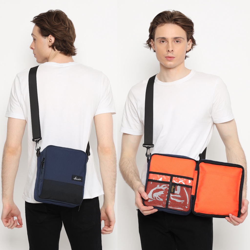 Sling bag CUBE Series dibuat dengan bahan utama kain PU coated water repellent. Lapisan dalam sling bag ini menggunakan bahan kain polyester berwarna orange yang biasanya digunakan untuk bahan utama (bagian luar) tas pada umumnya, sehingga sling bag Cube series ini semakin tebal dan kokoh. Sling bag ini di buat untuk menunjang keseharianmu membawa barang-barang yang wajib selalu dibawa. Sling bag Cube mempunyai banyak 2 ruang utama dan 6 slot didalamnya, sehingga barang- barang seperti buku tulis, ipad, dompet, handphone, charger, powerbank, card, dll dapat tertata dengan baik. Plastic Hardware dan zipper menggunakan merk YKK yang merupakan merk terpercaya di seluruh dunia untuk produk tsb.