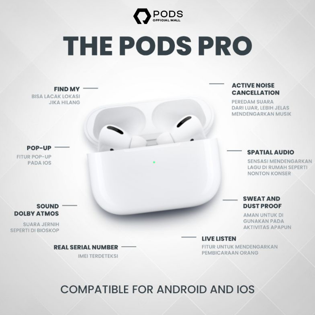Yuk di Check Fiturnya, - Sudah Real Battery Indicator - Highest & Final Grade, Grade Lain Belum Tentu Real Batternya - Chip Tertinggi (Qualcomm) , Sudah Persis Sama Pods Original - Active Noise Cancellation Feature (Fuction 30%) - Sudah bisa Spatial Audio - Size, Bahan, Kualitas Persis Mall Punya - Serial Number & Imei Valid dan bisa di Scan - Bisa Rename! - I.O.S / Android / Komputer / Laptop Bisa - Stable Qi Wireless Charging - Real Pop Ups - Smart Sensor & In-Ear Detection - Memakai Chip Tertinggi dan yang sama seperti di Mall - Bass Mantap dan Enhanced - Binaural Calls - Find My Bisa - Share Audio Feature - Battery Life sampai 3-4Jam - No Delay sama sekali - Fitur Lengkap - Trusted 100% - Ber Garansi - On Hand / Ready Stock