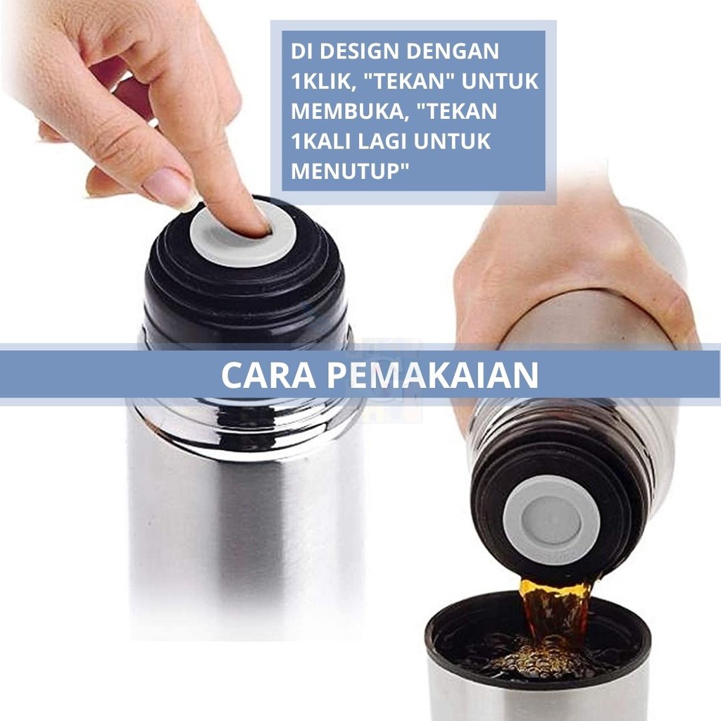 * Bahan Stainless Steel * Anti Karat * Anti Tumpah * Tutup terdapat "OPEN" dan "LOCK" * Bagian tutup bisa berfungsi sebagai cangkir * 3 Warna : Gold, Biru, Pink * Diameter -+6.5cm * Tinggi -+24CM